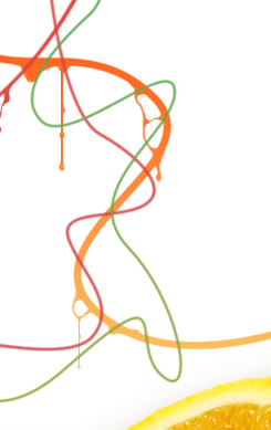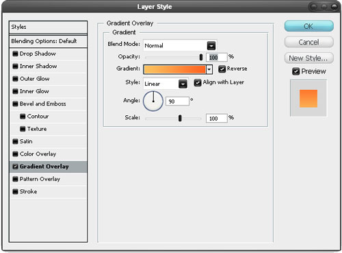 | Now right click on this layer then select blending options and add a gradient overlay. When choosing the colors for the gradient use the eyedropper to select the color from the pencil’s lead and the color from the fruit, in this case the orange. This means that the line will blend in to each of them. YOu may need to select reverse here if your gradient is the wrong way. |