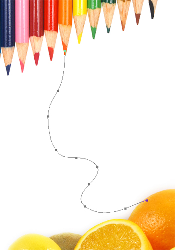 | Select the pen tool then make sure in the main toolbar that paths is selected. Start at one of the pencils then create a path going to a fruit of the same color. To make the first click at the starting point then click again a bit lower down but this time hold and drag as this will smooth the curve, keep doing this until you have a path similar to the one shown below. |